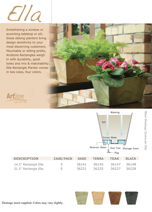 Embellishing a window or accenting tabletop or sill, these oblong planters bring design sensitivity to your most discerning customers. Mountable or sitting pretty, Artstone Rectangles weigh in with durability, good looks and mix & matchability. Ella Rectangle Planter comes in two sizes, four colors.